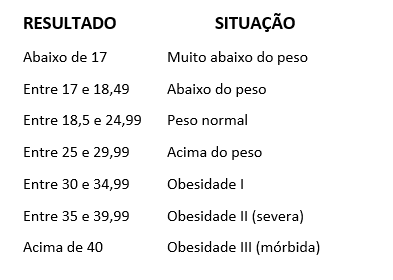 É simples: basta calcular o Índice de Massa Corporal (IMC), dividindo seu peso (em kg) por sua altura elevada ao quadrado. Depois, compare o resultado com a tabela: